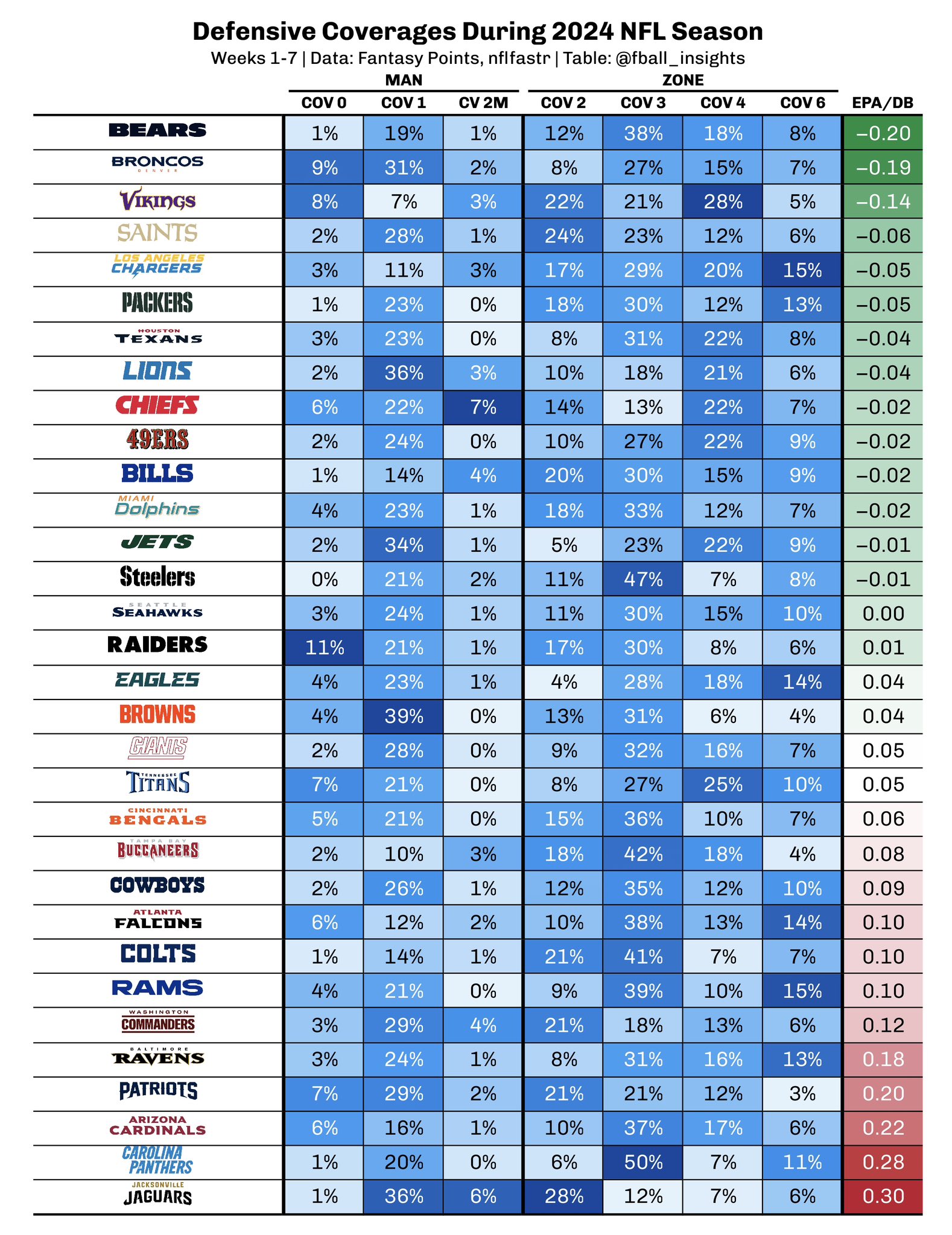 Between Cover 1 and Cover 3, the Cowboys play a combined 61% of their snaps in single high. While that may be down from the seasons prior, it still represents their two most popular coverages seven weeks into 2024.