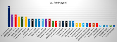 Just to be clear, the players included in this data set are both first- and second-team All-Pros, so if you have higher standards, feel free to bump Byron Jones, Leighton Vander Esch, and Tyler Smith off the list. Of course, seven is still pretty good, and most of the other teams also drop as well.